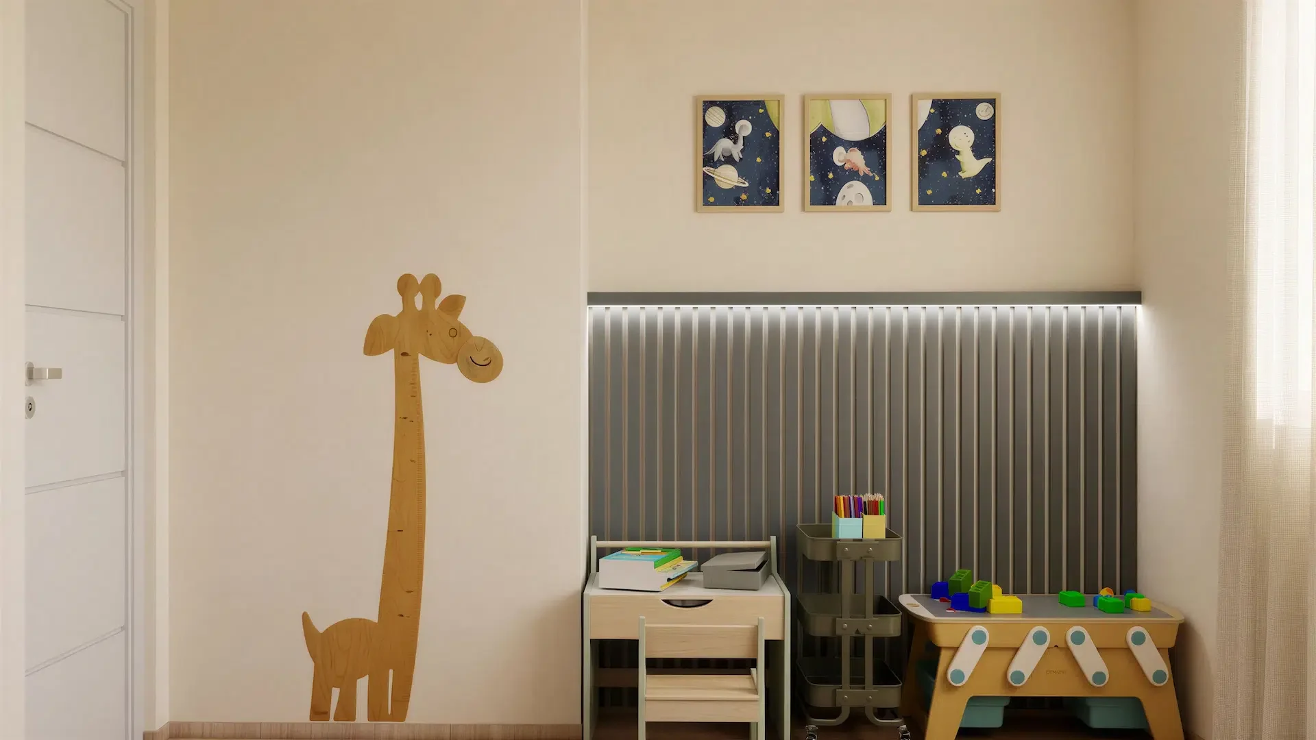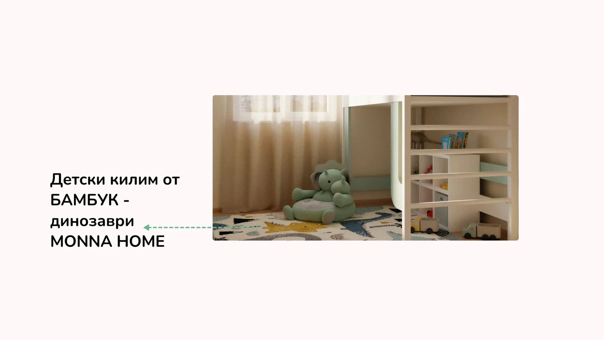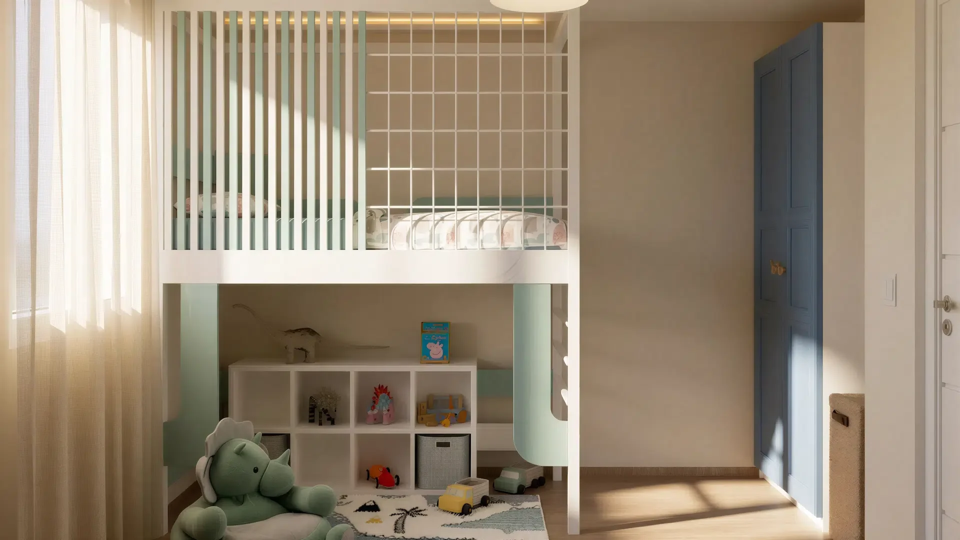 Функционална детска стая, проектирана за момче, с многофункционално двойно легло: горно ниво за сън и долно – зона за игра. Конструкцията включва шведска стена и елементи за гимнастика, насърчаващи физическа активност у дома. До леглото е оформен кът за рисуване с тематична декорация в синьо и нюанси на мента, и отворени етажерки за книжки. Стената срещу леглото включва гардероб с уникални динозавърски дръжки и регулируемо бюро, което се адаптира към възрастта на детето. Закачалка и осветително тяло на тавана също следват динозавърската тематика. Меката палитра от бяло, мента и светъл дъб създава светла, спокойна и вдъхновяваща среда.