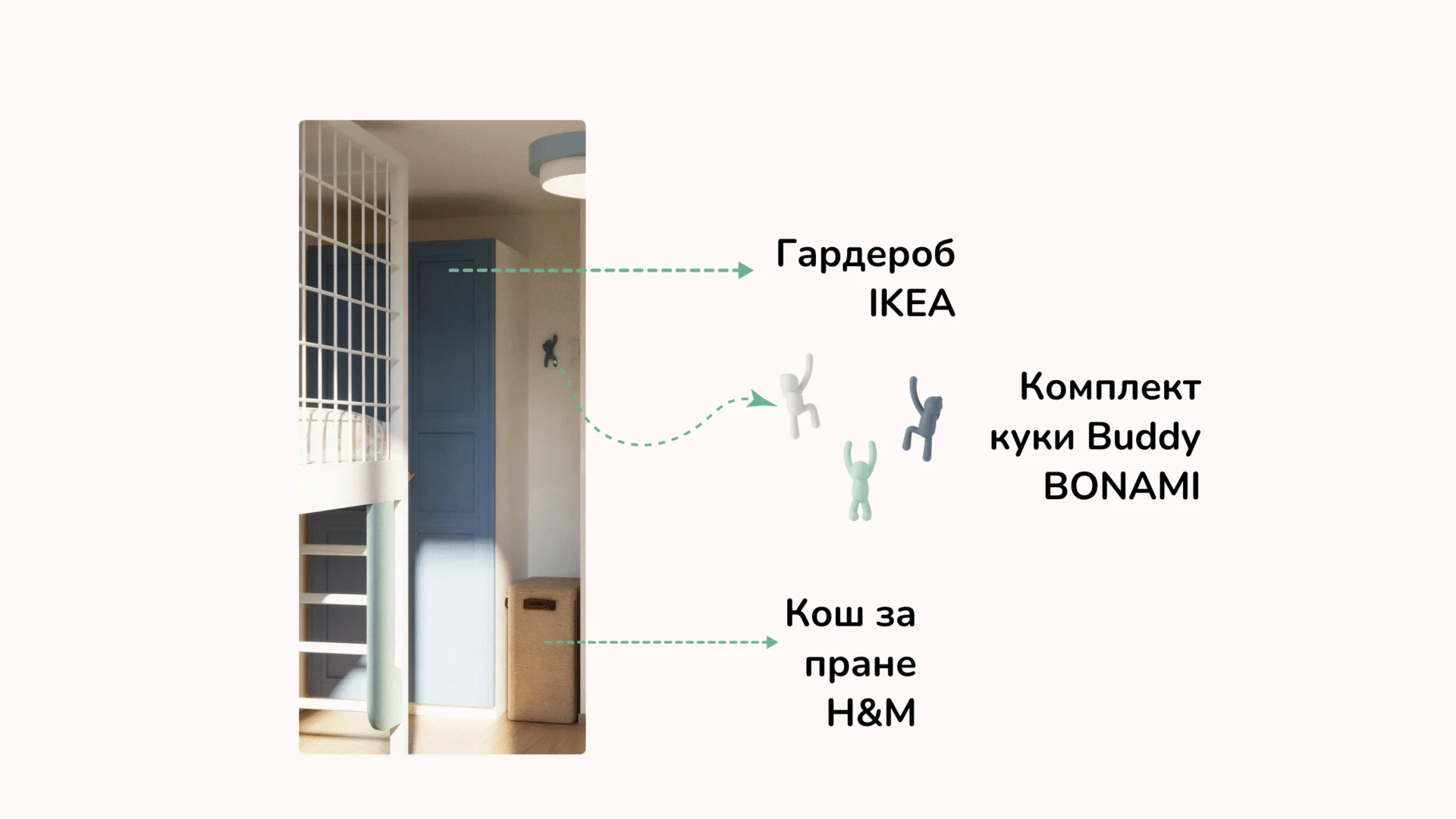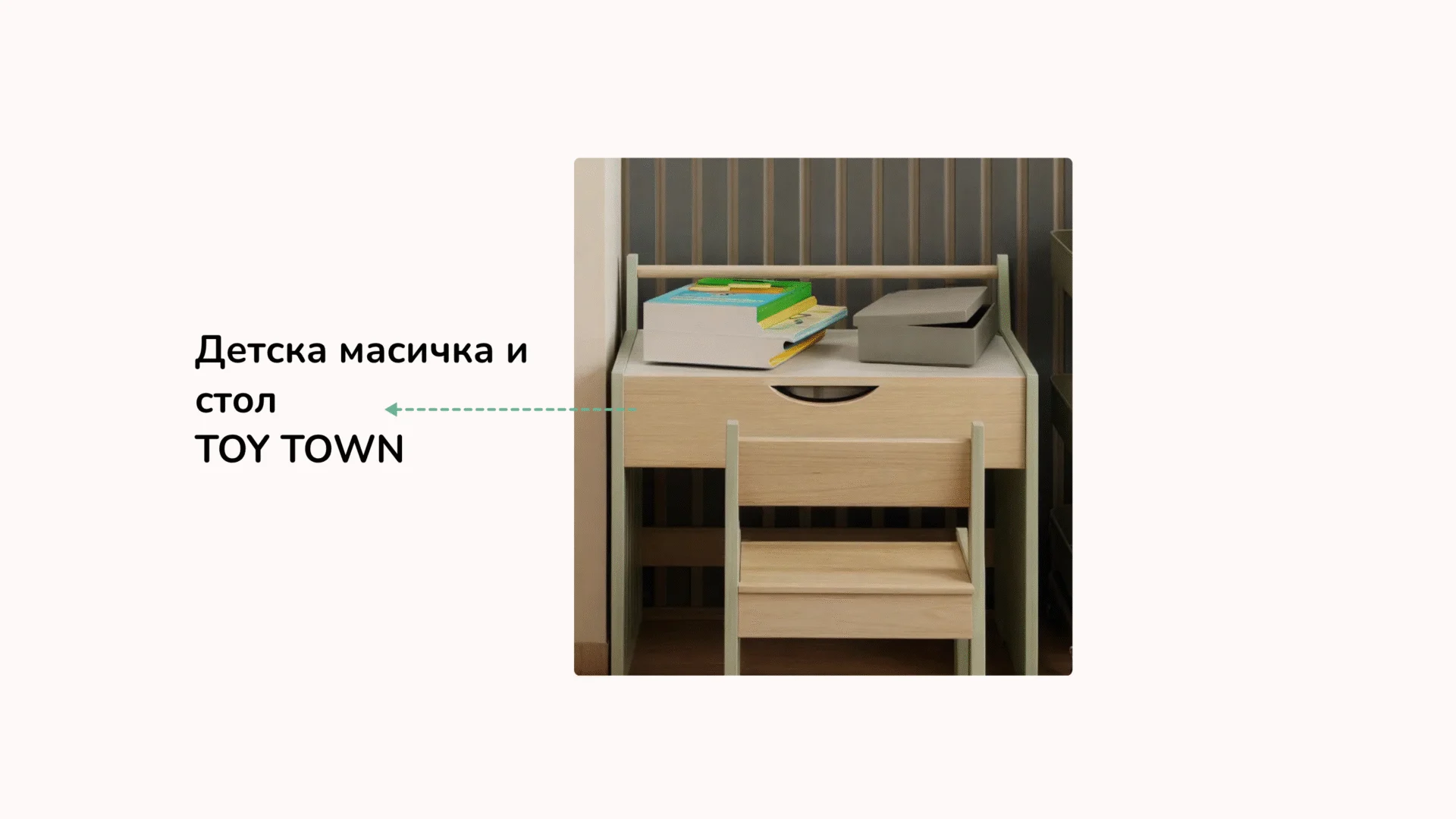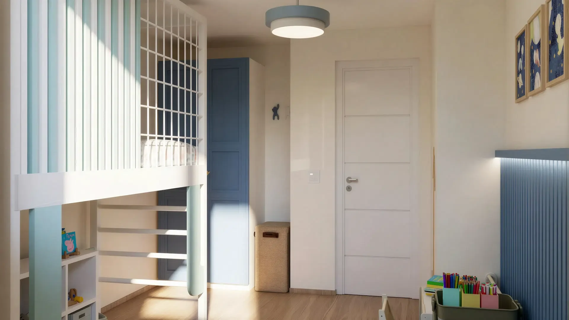 Функционална детска стая, проектирана за момче, с многофункционално двойно легло: горно ниво за сън и долно – зона за игра. Конструкцията включва шведска стена и елементи за гимнастика, насърчаващи физическа активност у дома. До леглото е оформен кът за рисуване с тематична декорация в синьо и нюанси на мента, и отворени етажерки за книжки. Стената срещу леглото включва гардероб с уникални динозавърски дръжки и регулируемо бюро, което се адаптира към възрастта на детето. Закачалка и осветително тяло на тавана също следват динозавърската тематика. Меката палитра от бяло, мента и светъл дъб създава светла, спокойна и вдъхновяваща среда.