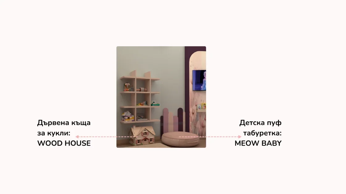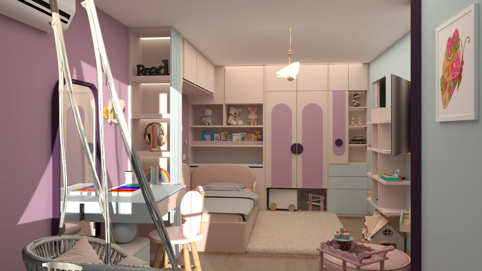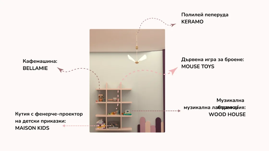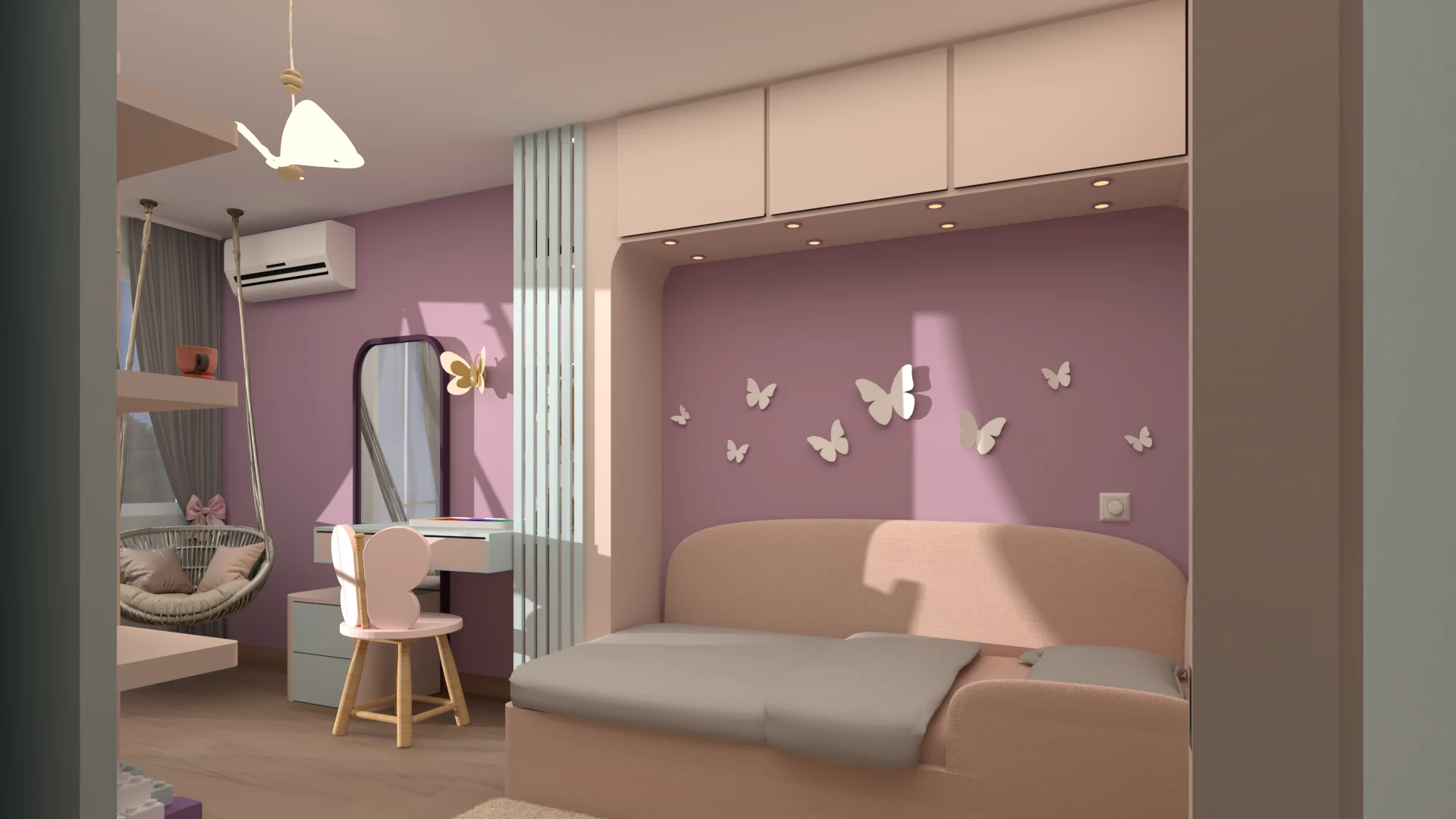 Детската стая с пеперуди съчетава уют, функционалност и вдъхновение. Акцент е стената зад леглото, боядисана в лилаво с 3D пеперуди за приказна атмосфера, а останалите стени са в синьо за баланс. Мебелите са практични, с вградени шкафове и скрити рафтове за съхранение, а специален шкаф може да се ползва както за играчки, така и по-късно за учебници. Над леглото има лунички с димерно осветление, за спокоен сън. Кътът за учене е компактен и може да служи като тоалетка, а LED лентите по рафтовете придават елегантна и модерна визия на стаята, като едновременно с това осигуряват практично локално осветление в зоната за учене. Всяка зона е обмислена така, че да расте с детето и да запази стаята просторна и вдъхновяваща.