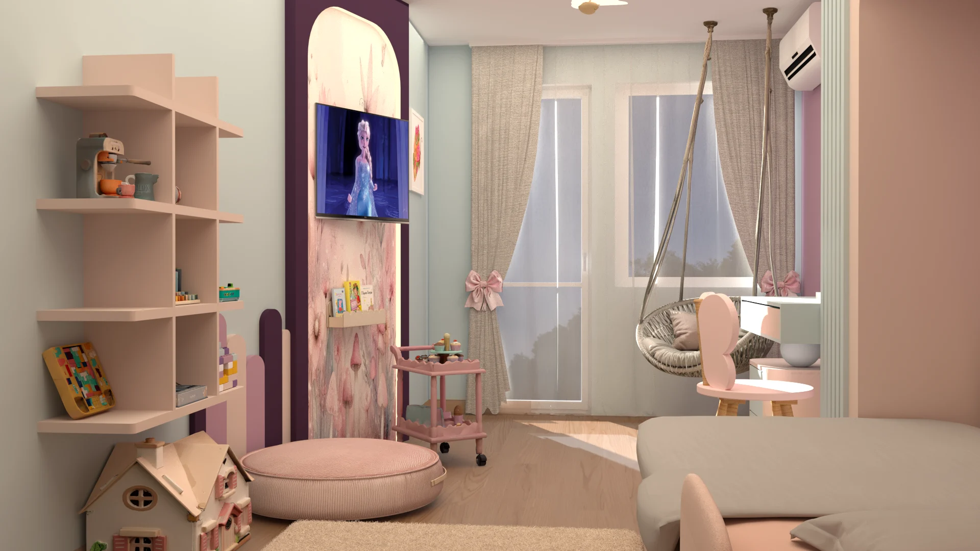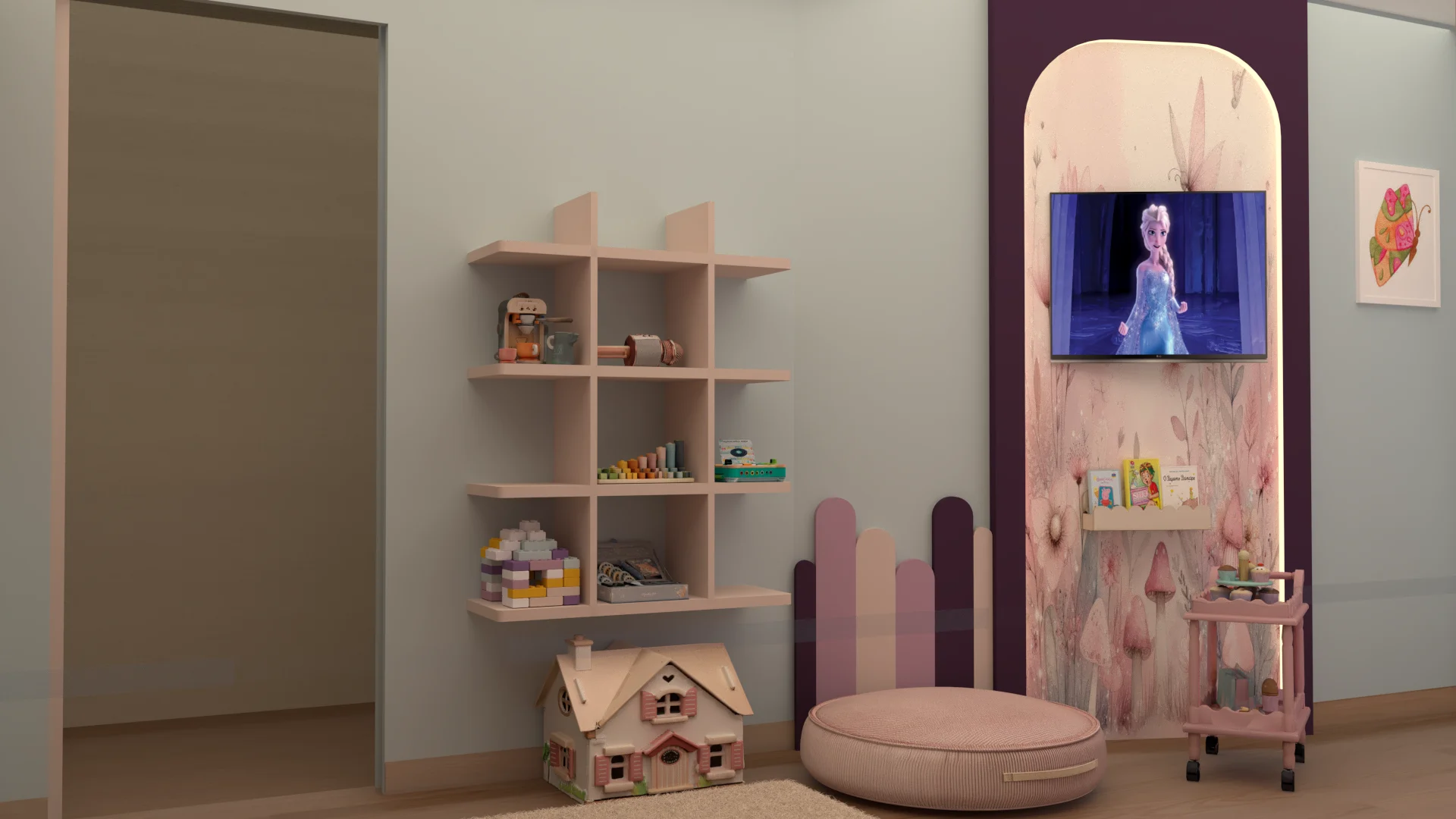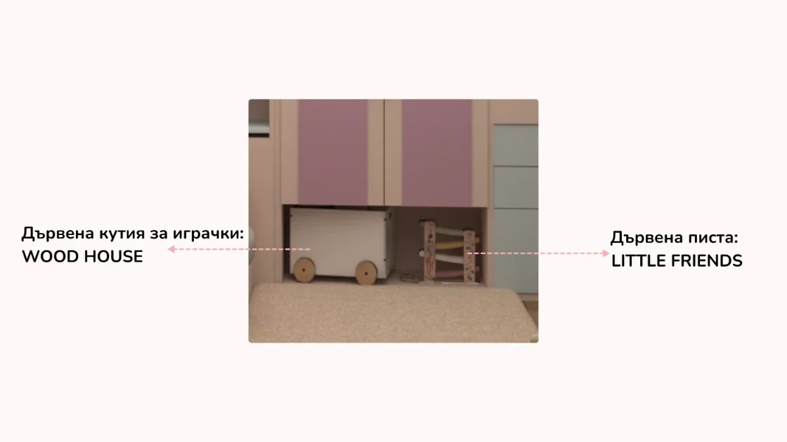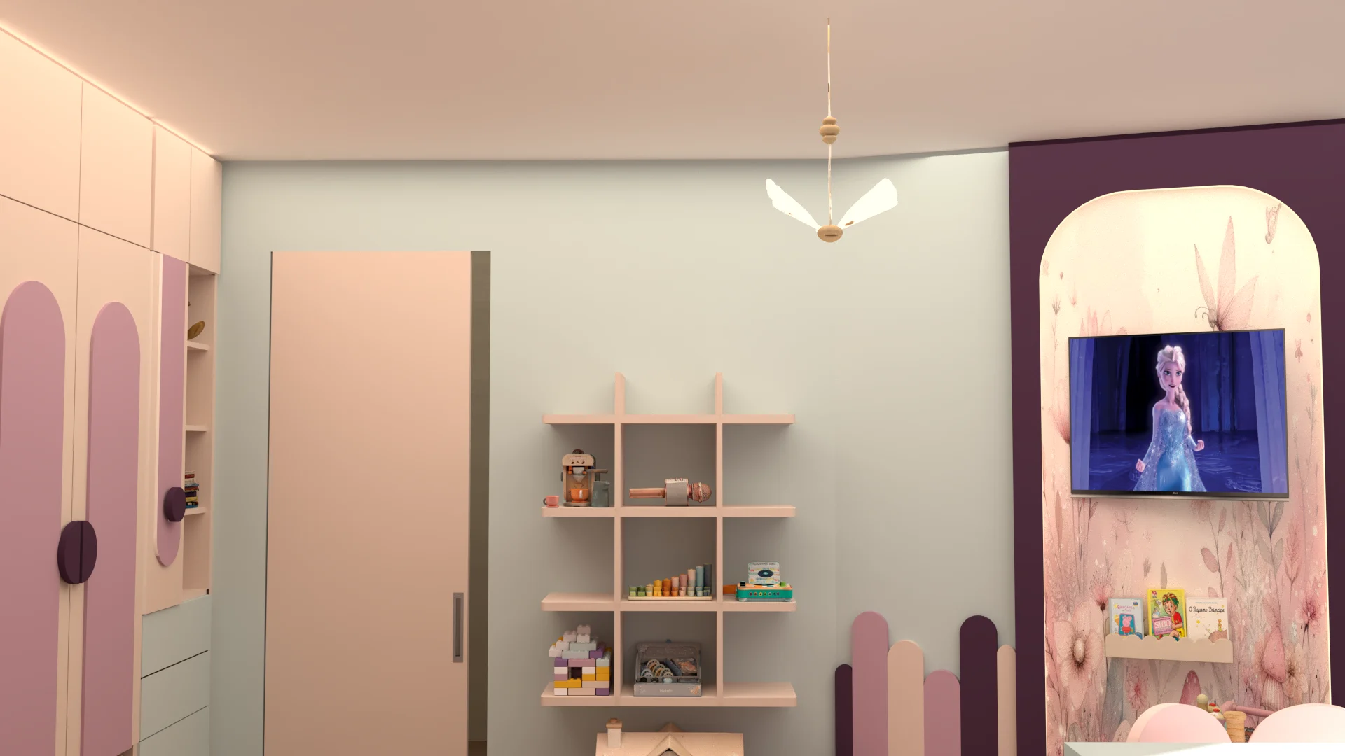 Детската стая с пеперуди съчетава уют, функционалност и вдъхновение. Акцент е стената зад леглото, боядисана в лилаво с 3D пеперуди за приказна атмосфера, а останалите стени са в синьо за баланс. Мебелите са практични, с вградени шкафове и скрити рафтове за съхранение, а специален шкаф може да се ползва както за играчки, така и по-късно за учебници. Над леглото има лунички с димерно осветление, за спокоен сън. Кътът за учене е компактен и може да служи като тоалетка, а LED лентите по рафтовете придават елегантна и модерна визия на стаята, като едновременно с това осигуряват практично локално осветление в зоната за учене. Всяка зона е обмислена така, че да расте с детето и да запази стаята просторна и вдъхновяваща.